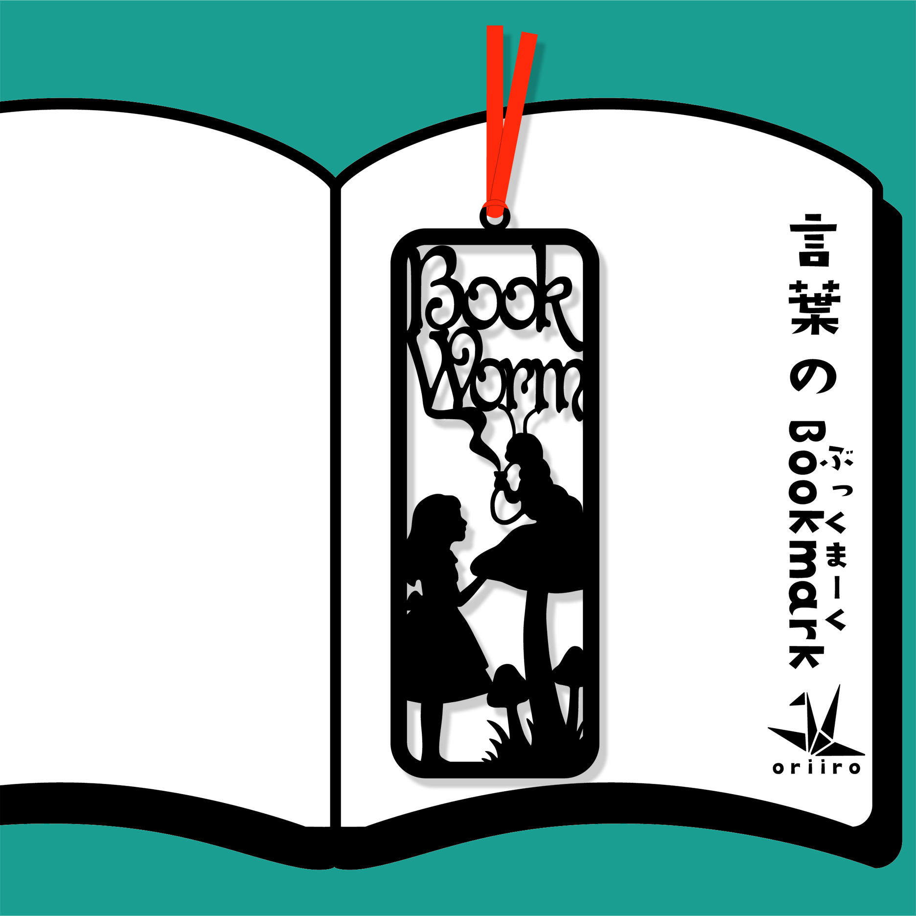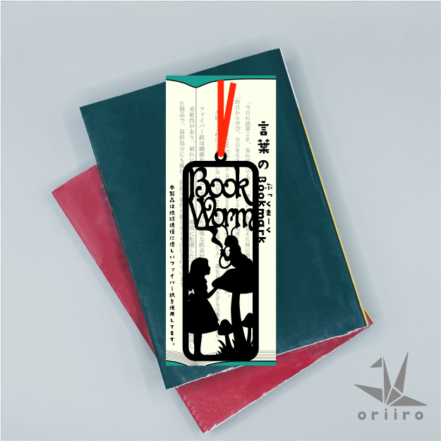 「Book Worm」という言葉が持つ豊かな意味とともに、アリスとイモムシのシルエットがデザインされており、読書の楽しさを感じることができます。このしおりは軽量で耐久性の高い素材で作られており、日常使いに最適です。しおりを見るたびに、アリスの冒険の世界に引き込まれることでしょう。