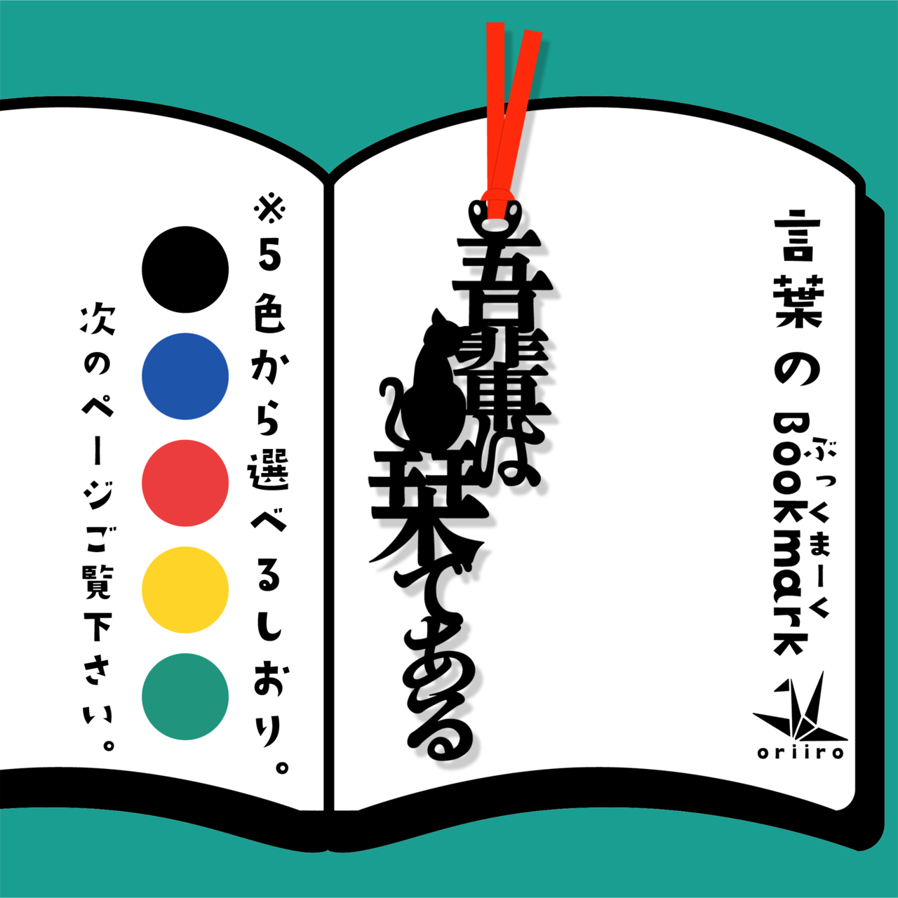 「吾輩は栞である」というユニークなフレーズが、読書好きの心をくすぐります。しおりには愛らしい猫のイラストが描かれ、本の世界に癒しをプラスします。